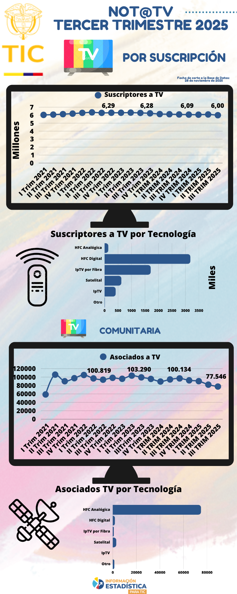 Para conocer el detalle de la información se sugiere consultar el archivo en Excel denominado Informe de televisión por suscripción del tercer trimestre del año 2025, publicado en el portal oficial de estadísticas del sector - Colombia TIC